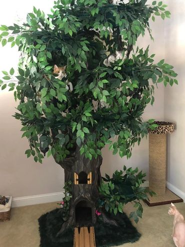This extra large cat tree is the ultimate cat tree. It has 5 large tree-top platforms. This 8' tall cat climbing tree is great exercise for your cats.