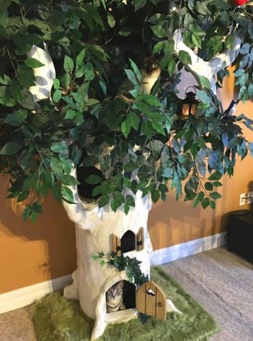 It has 2 shelves inside the tree trunk to lay on and look out, or your cats can use them to climb up to the tree-top platforms. Your cats also have the space at the bottom of the tree trunk to curl up in.